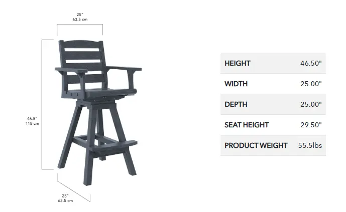 This armchair pairs perfectly with pub-height tables between 41"-42" tall, making it an ideal addition to patios, rooftop lounges, and commercial settings. The supportive arm design, sturdy frame, and easy-to-clean recycled plastic construction offer a seamless blend of style and everyday durability.